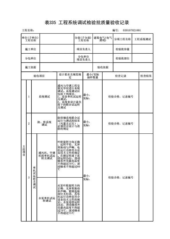 表格名称:030107021001 工程系统调试检验批质量验收记录