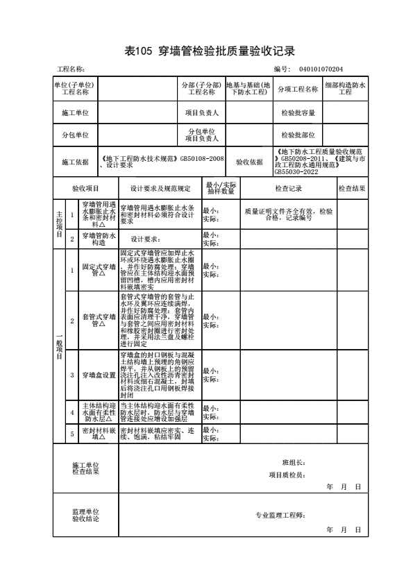 表格名称:040101070204 穿墙管检验批检验批质量验收记录