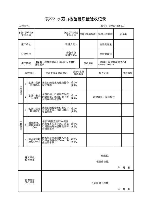 表格名称:040104050401 水落口检验批质量验收记录