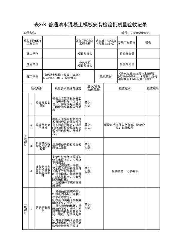 表格名称:070302010104 普通清水混凝土模板安装检验批质量验收记录