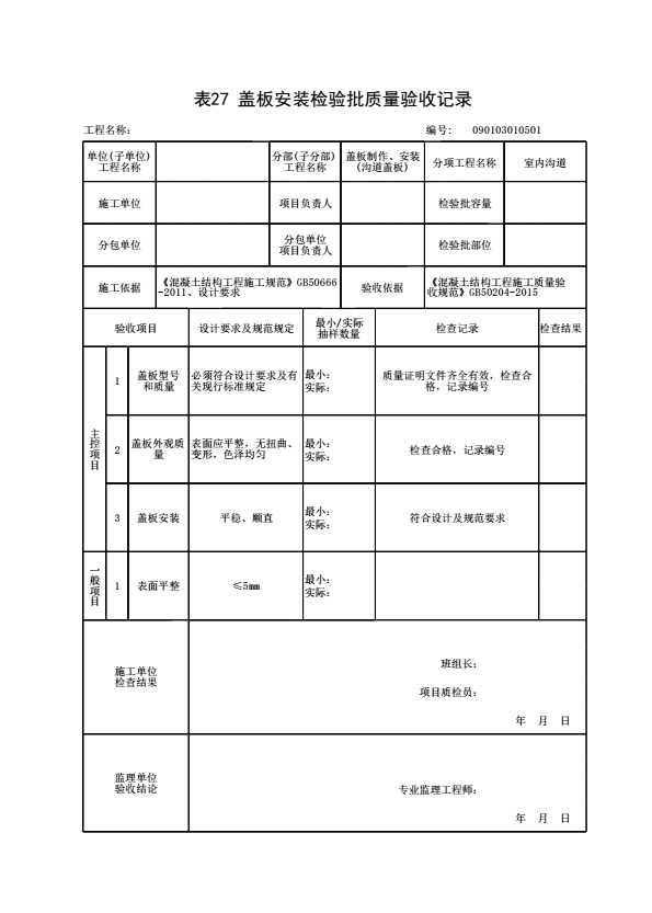 表格名称:090103010501 盖板安装检验批检验批质量验收记录
