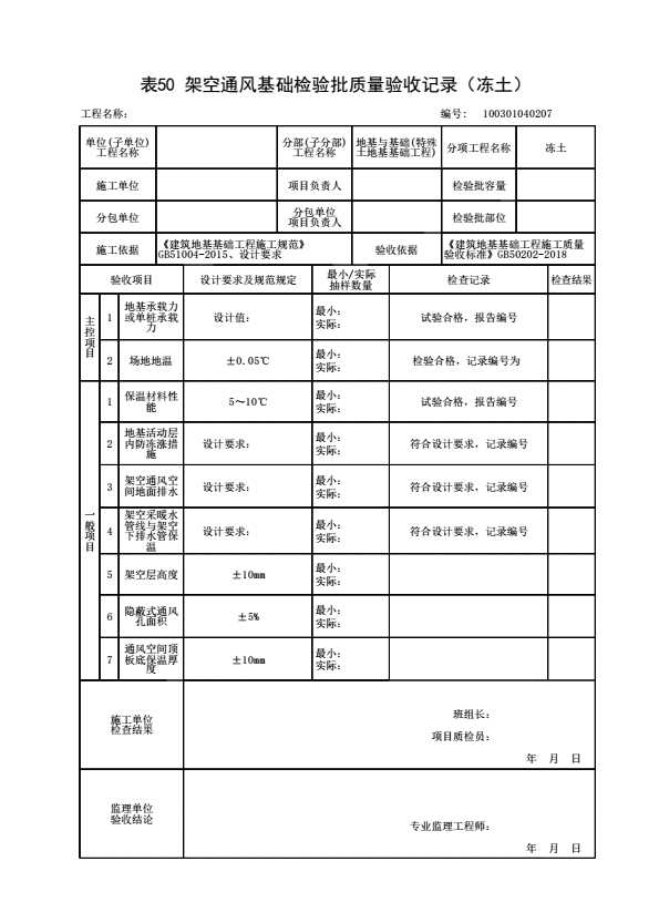 表格名称:100301040207 架空通风基础检验批质量验收记录(冻土)