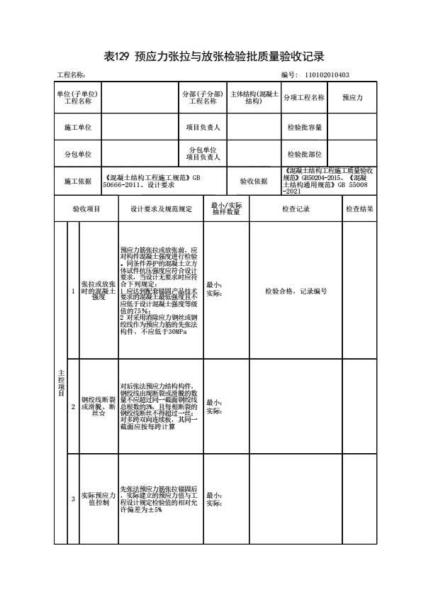 表格名称:110102010403 预应力张拉与放张检验批质量验收记录