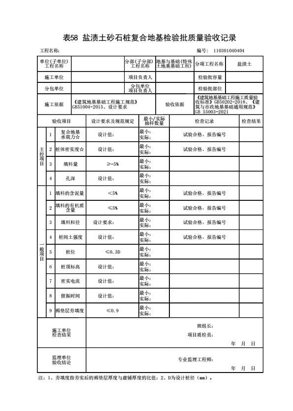 表格名称:110301040404 盐渍土砂石桩复合地基检验批质量验收记录