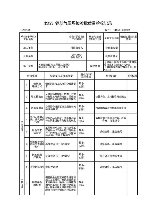 表格名称:110501060212 钢筋气压焊检验批质量验收记录