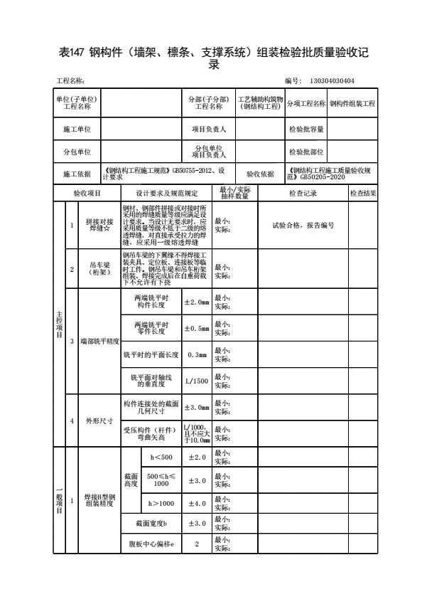 表格名称:130304030404 钢构件(墙架、檩条、支撑系统)组装检验批质量验收记录