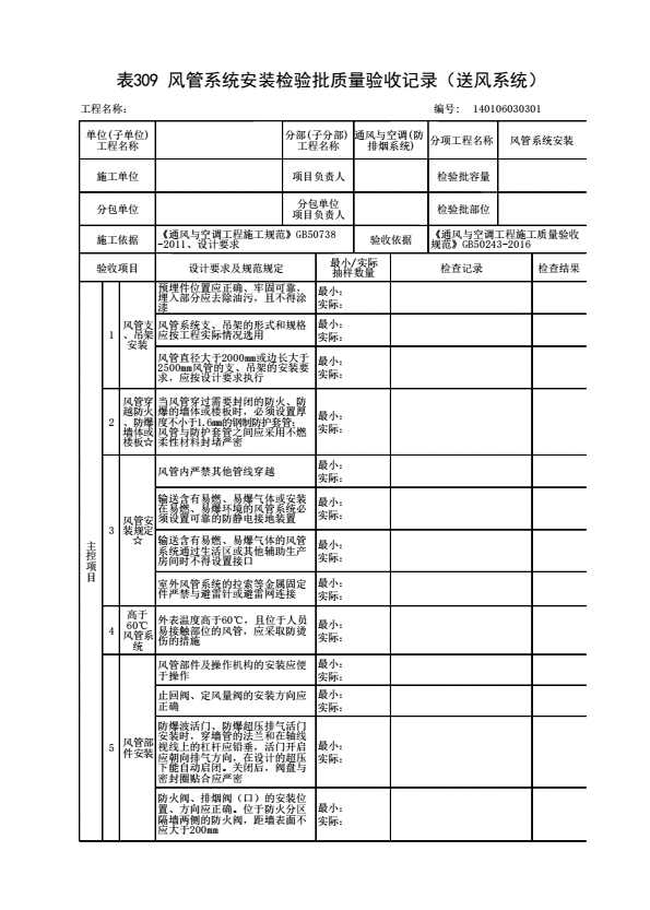 表格名称:140106030301 风管系统安装检验批质量验收记录(送风系统)