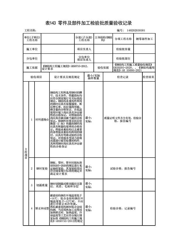 表格名称:140202030301 零件及部件加工检验批质量验收记录