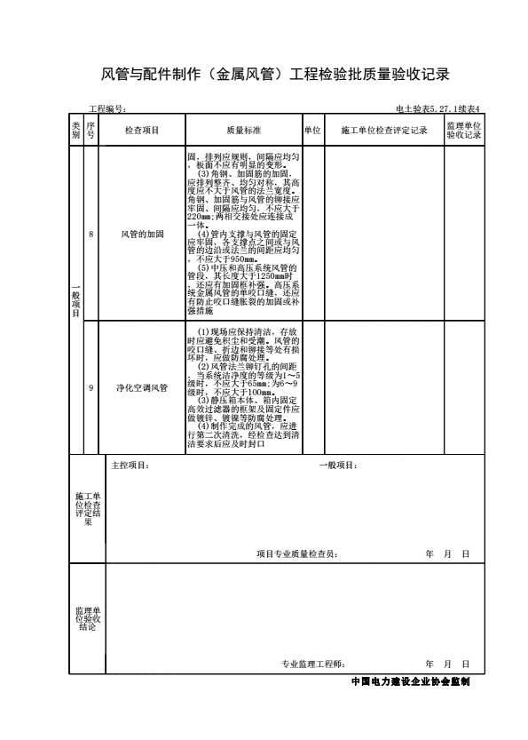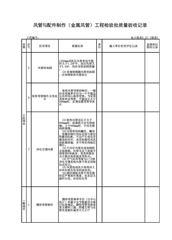 表格名称:电土验表5.27.1 风管与配件制作(金属风管)工程检验批质量验收记录
