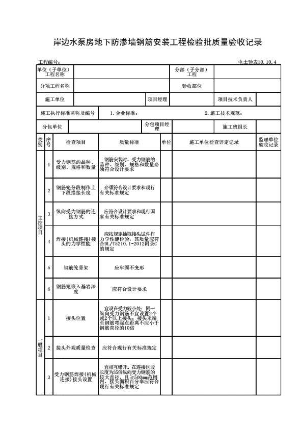 表格名称:电土验表10.10.4 岸边水泵房地下防渗墙钢筋安装工程检验批质量验收记录