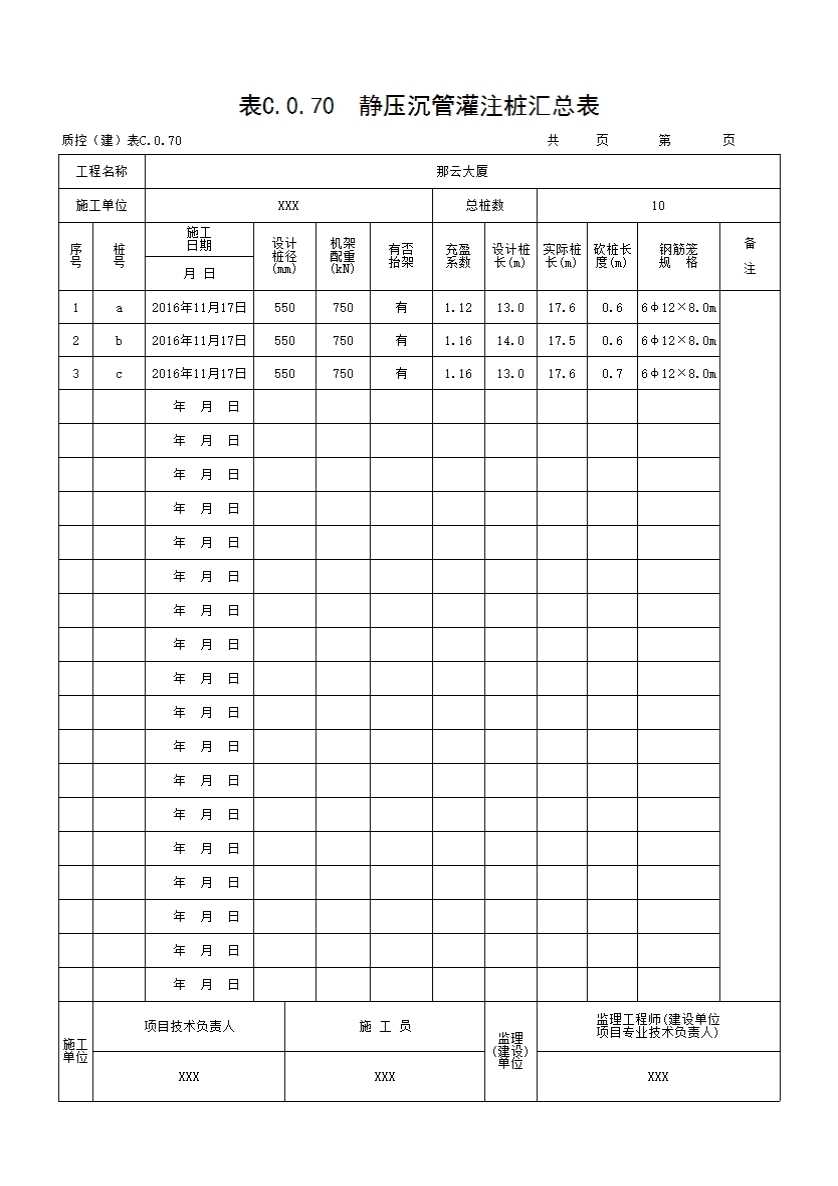 质控(建)表C.0.70静压沉管灌注桩汇总表