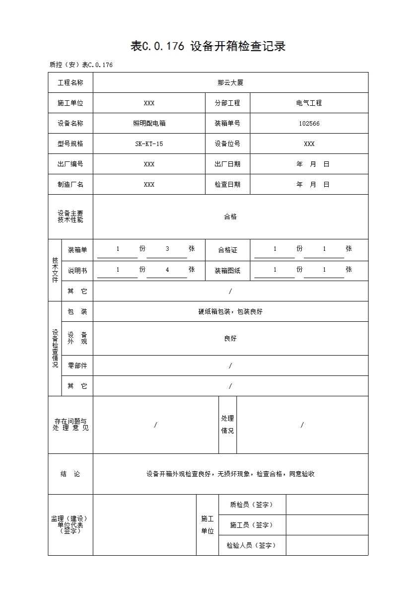 6 材料、设备进入施工现场时应进行验收和开箱检查,核验其型号、规格和质量,不合格产品严禁用于工程。主要设备开箱检验情况应按附录C表C.0.176的规定填写。