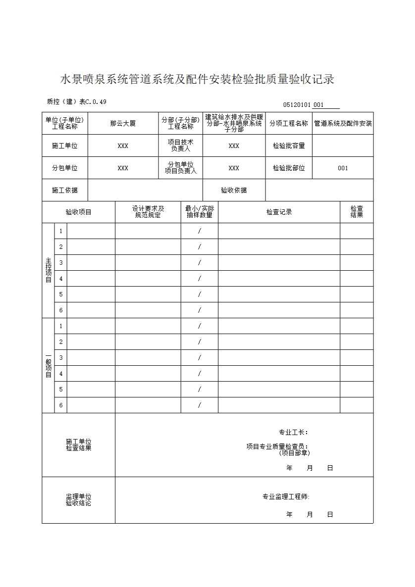 表格名称:05120101_水景喷泉系统管道系统及配件安装检验批质量验收记录