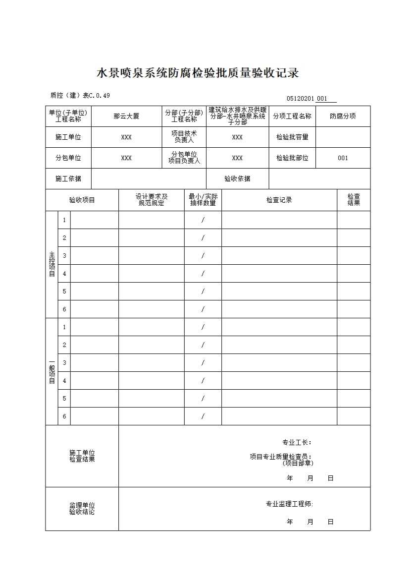 表格名称:05120201_水景喷泉系统防腐检验批质量验收记录