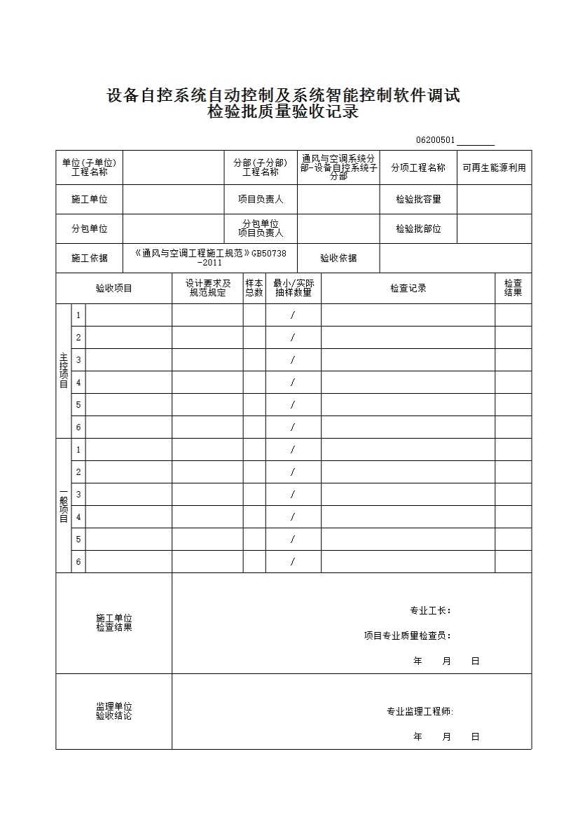 表格名称:06200501_设备自控系统可再生能源利用检验批质量验收记录