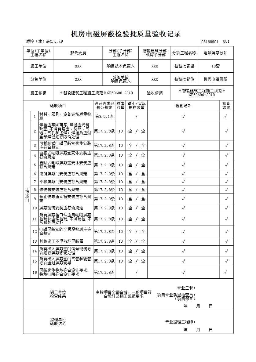 17.2.8 电磁屏蔽工程的施工应执行国家标准《电子信息系统机房施工及验收规范》GB 50462-2008第10章的规定。