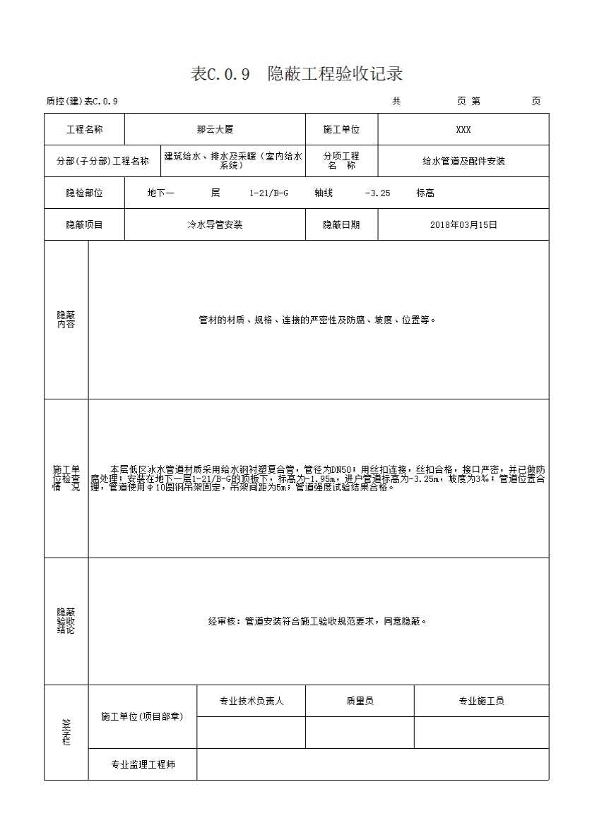 4 隐蔽验收情况应按本规程附录 C 表 C.0.9 的规定记录,表中应详细填写下列内容: