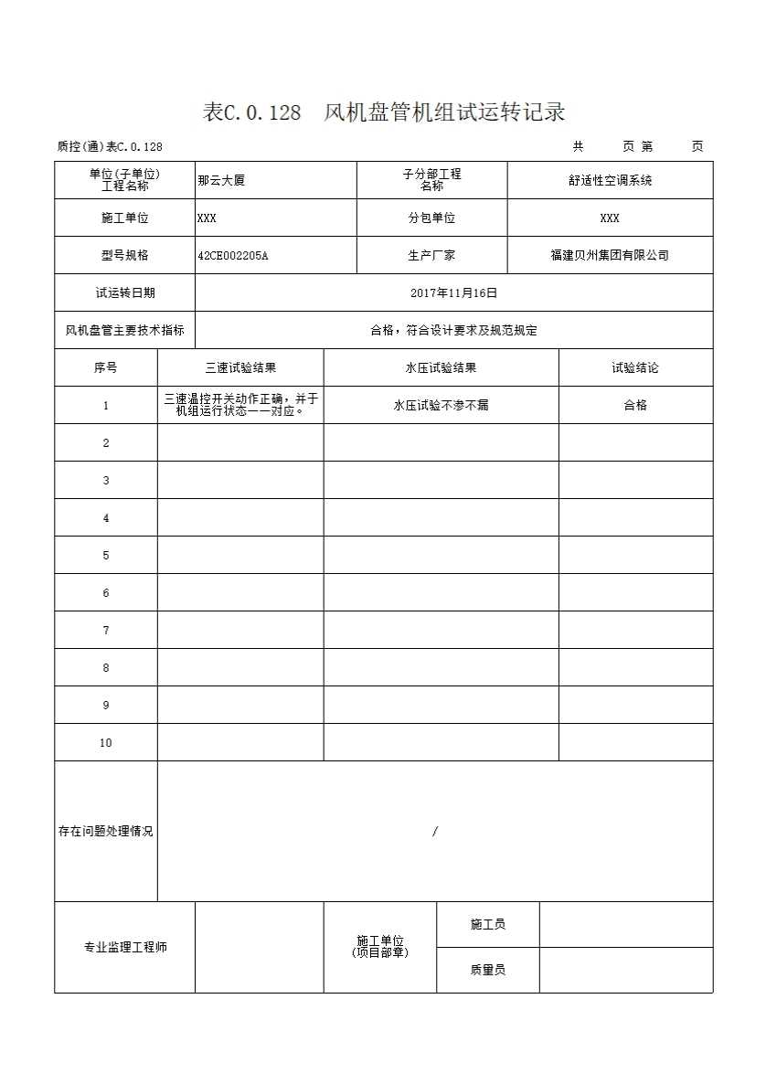 质控(通)表C.0.128 风机盘管机组试运转记录