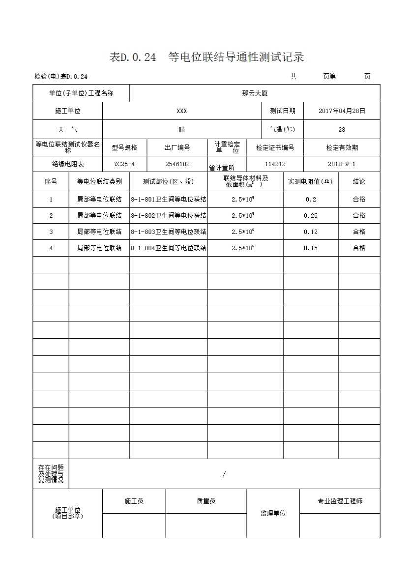 1 无等电位联结导通性测试记录;