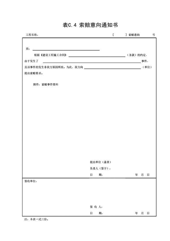 5 索赔意向通知书应符合附录表C.4的格式,由索赔意向提出单位填报。本表一式三份,项目监理机构签署意见后自留一份,报建设单位一份,返回施工单位一份。