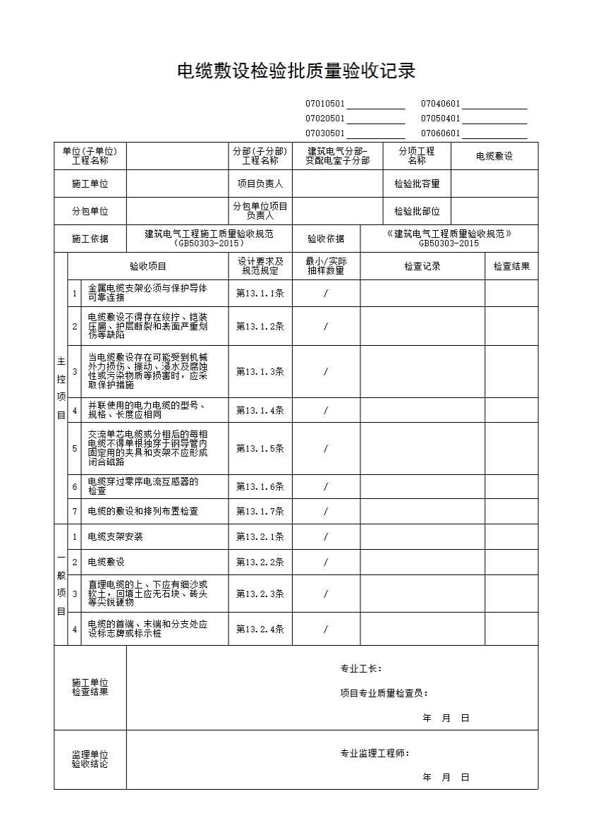 检查数量:按每检验批电缆线路抽查20%,且不得少于1条电缆线路并应能覆盖上述不同的检查内容。