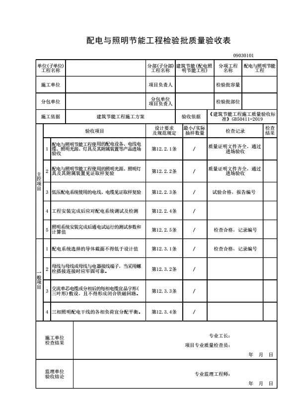 12.2.1 配电与照明节能工程使用的配电设备、电线电缆、照明光源、灯具及其附属装置等产品应进行进场验收,验收结果应经监理工程师检查认可,且应形成相应的验收记录。各种材料和设备的质量证明文件与要关技术资料应齐全,并应符合设计要求和国家现行有关标准的规定。