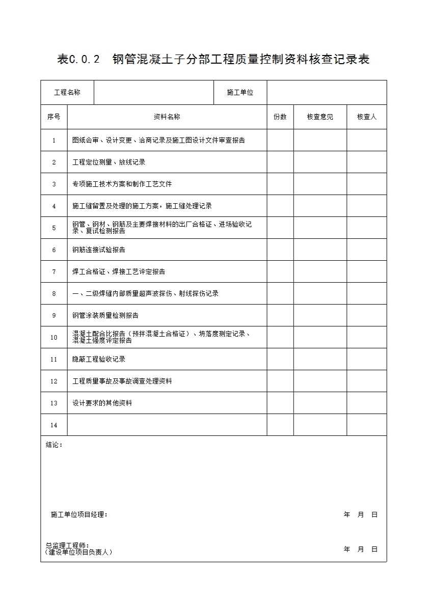 表格名称:表C.0.2 钢管混凝土子分部工程质量控制资料核查记录表