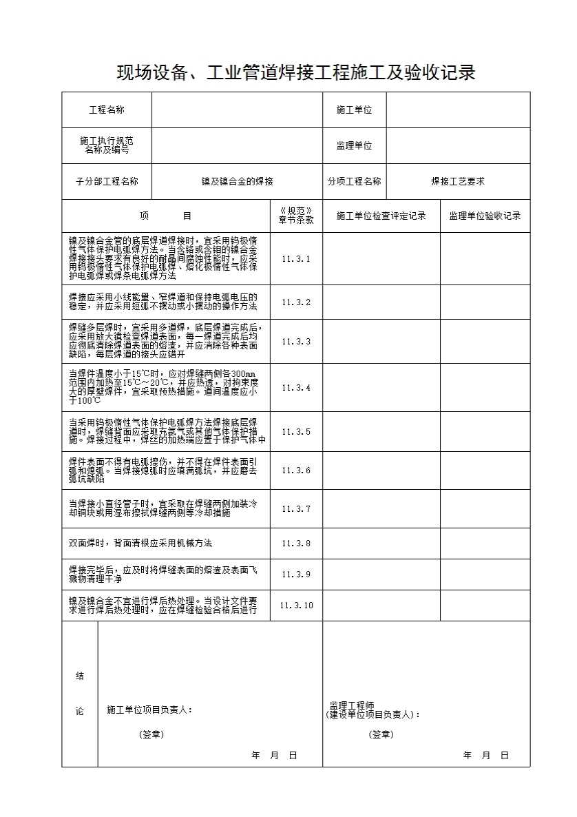 表格名称:镍及镍合金的焊接(焊接工艺要求)