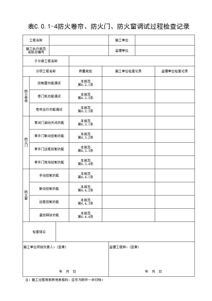 表格名称:表C.0.1-4 防火卷帘、防火门、防火窗调试过程检查记录