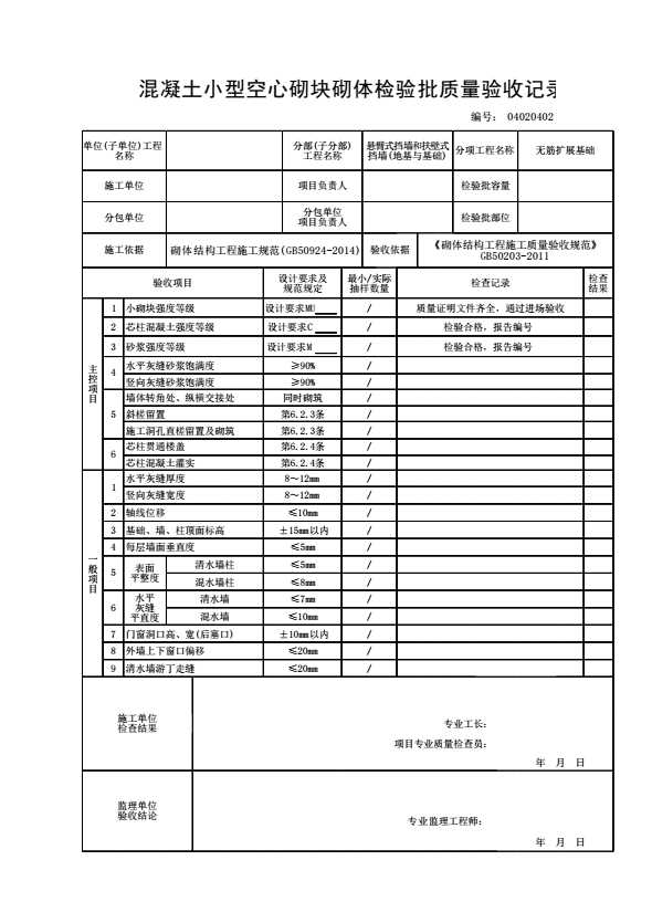 04020402 混凝土小型空心砌块砌体检验批质量验收记录