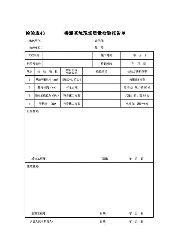 表格名称:检验表43 桥涵基坑现场质量检验报告单