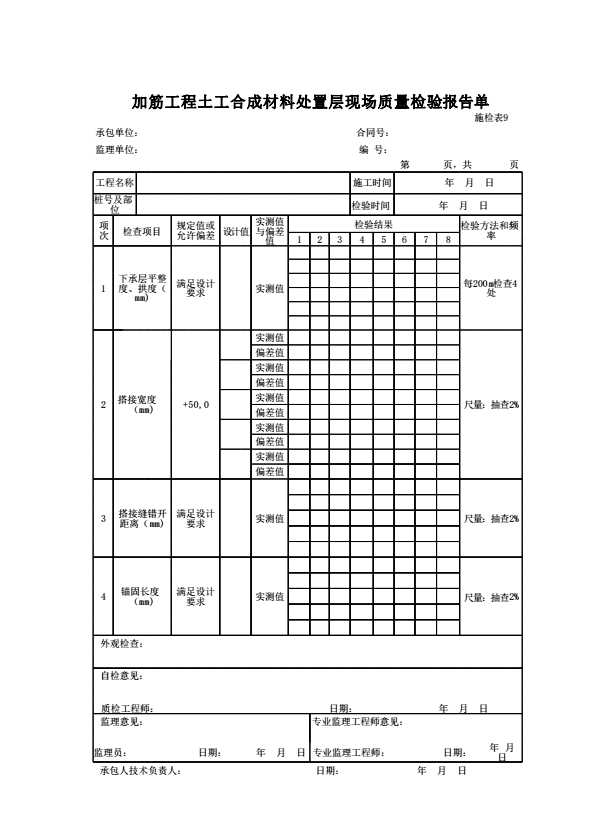 表格名称:施检表9 加筋工程土工合成材料处置层现场质量检验报告单