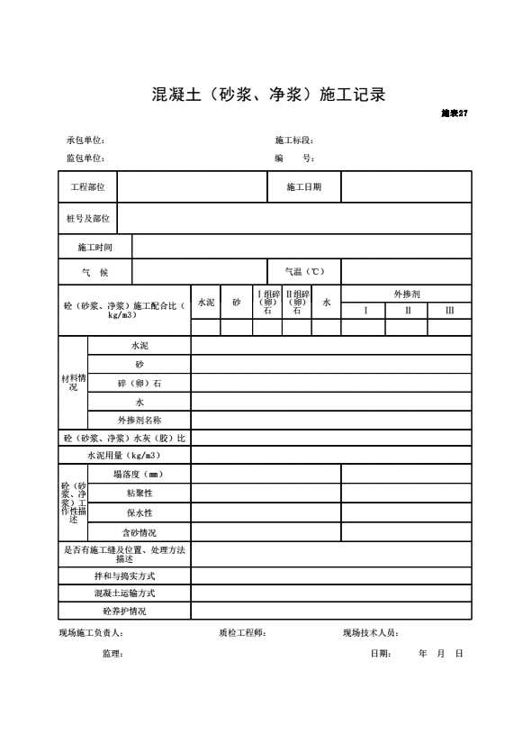 表格名称:施表27 混凝土(砂浆、净浆)施工记录
