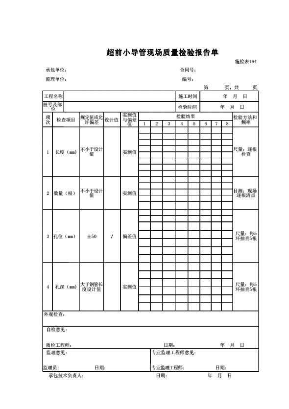 表格名称:施检表194 超前小导管现场质量检验报告单