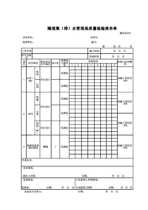 表格名称:施检表284 隧道集(排)水管现场质量检验报告单