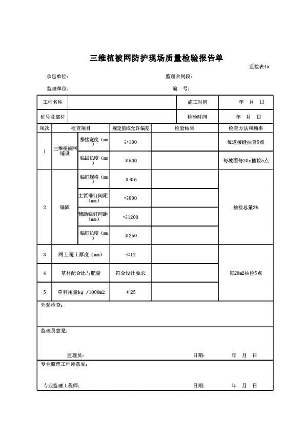 表格名称:监检表45 三维植被网防护现场质量检验报告单