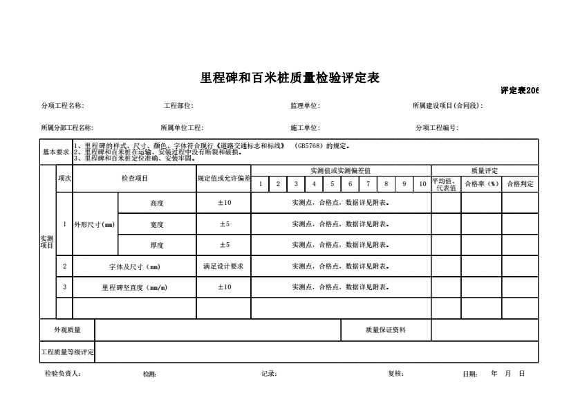 评定表206 里程碑和百米桩质量检验评定表