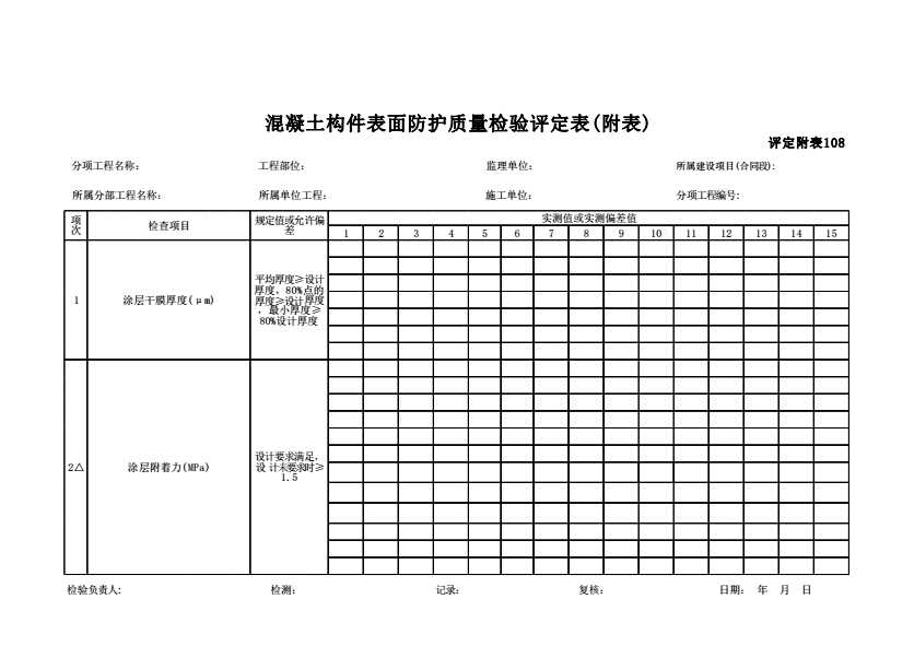 表格名称:评定表108 混凝土构件表面防护质量检验评定表