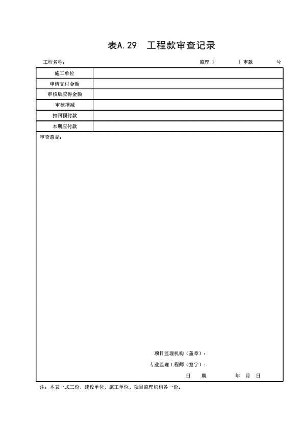 4 工程款审查记录应符合附录表 A. 29的格式表,由专业监理工程师审查填写记录人本表一式三份,项目监理机构、建设单位、施工单位各一份。