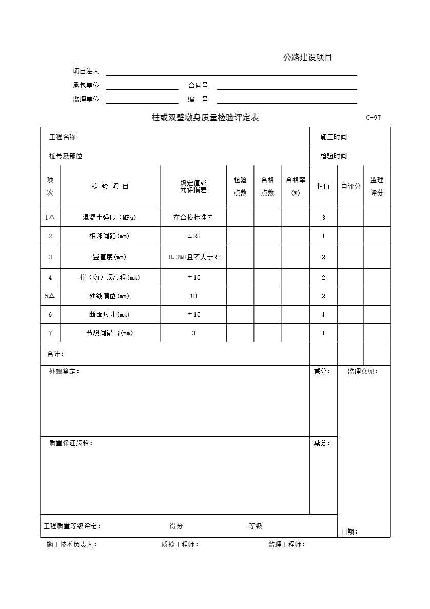 表格名称:C-97 柱或双壁墩身质量检验评定表