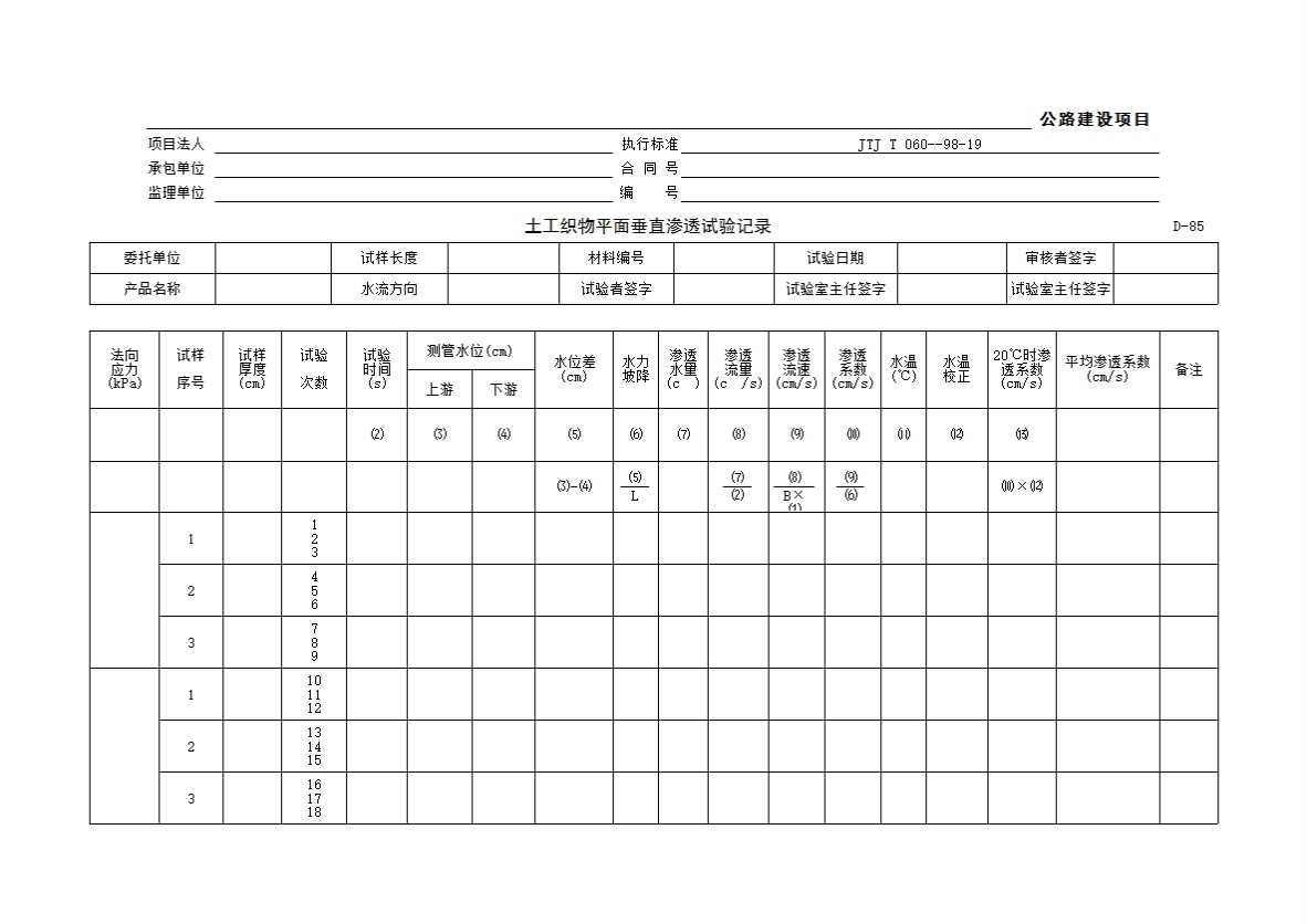 表格名称:D-85 土工织物平面渗透试验记录