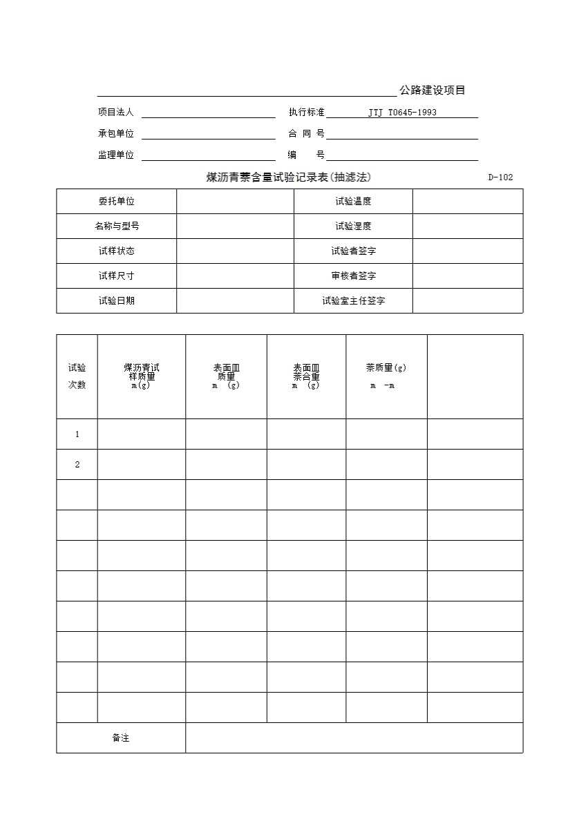 表格名称:D-102 煤沥青萘含量试验记录表(抽滤法)