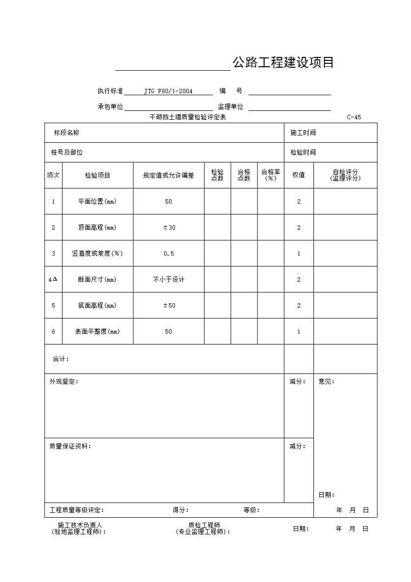 表格名称:C-45表 干砌挡土墙质量检验评定表
