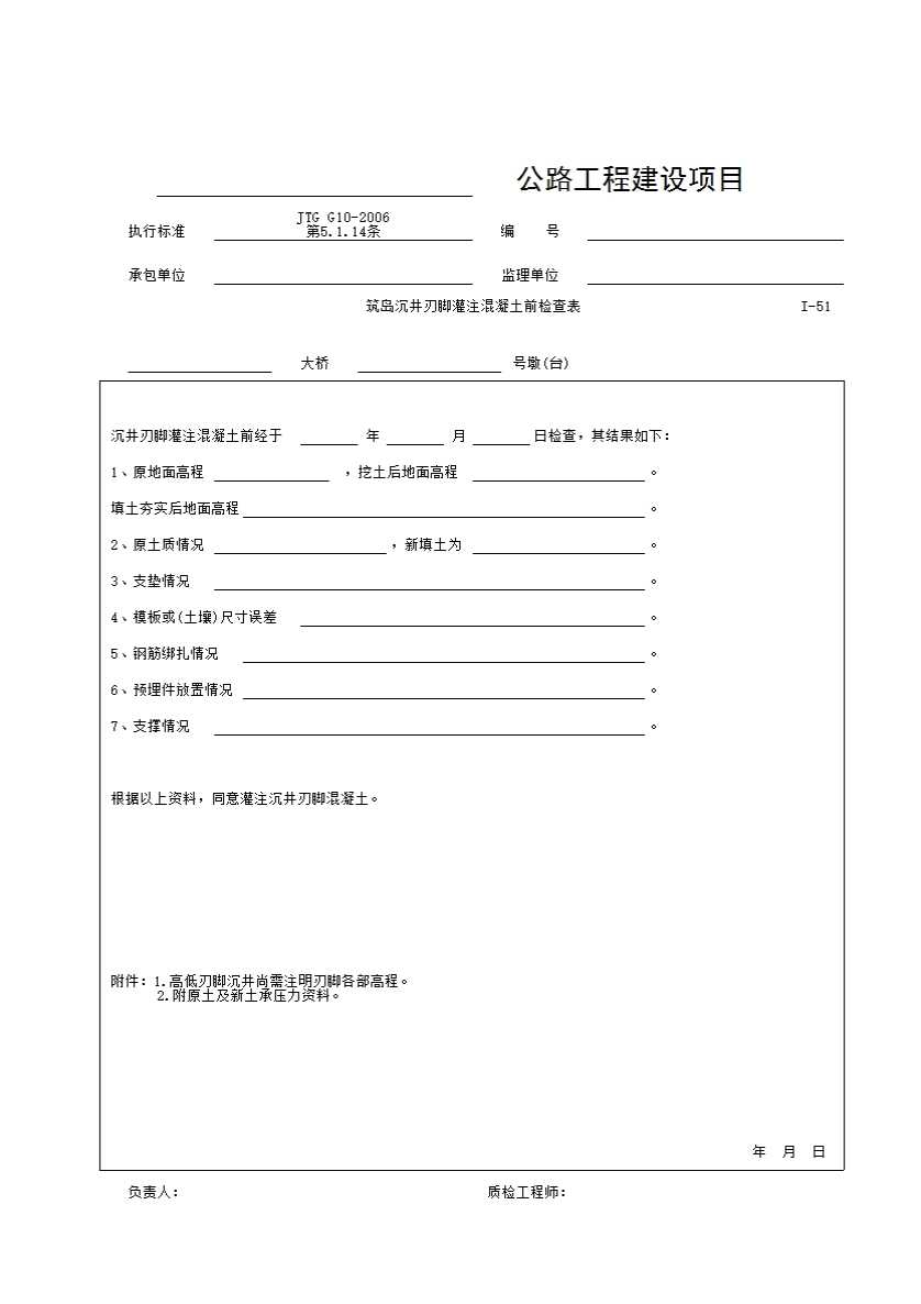 表格名称:I-51表 筑岛沉井刃脚灌注混凝土前检查表