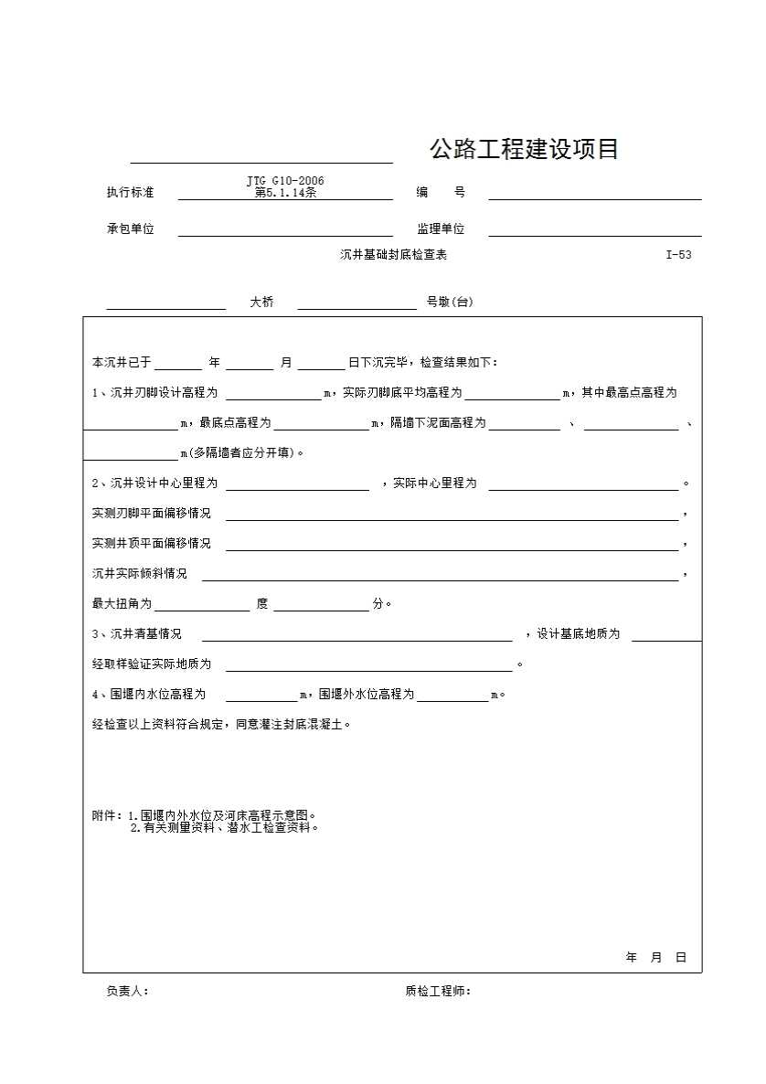 表格名称:I-53表 沉井基础封底检查表