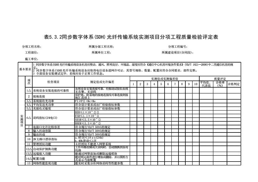 表格名称:表5.3.2 同步数字体系(SDH)光纤传输系统实测项目分项工程质量检验评定表