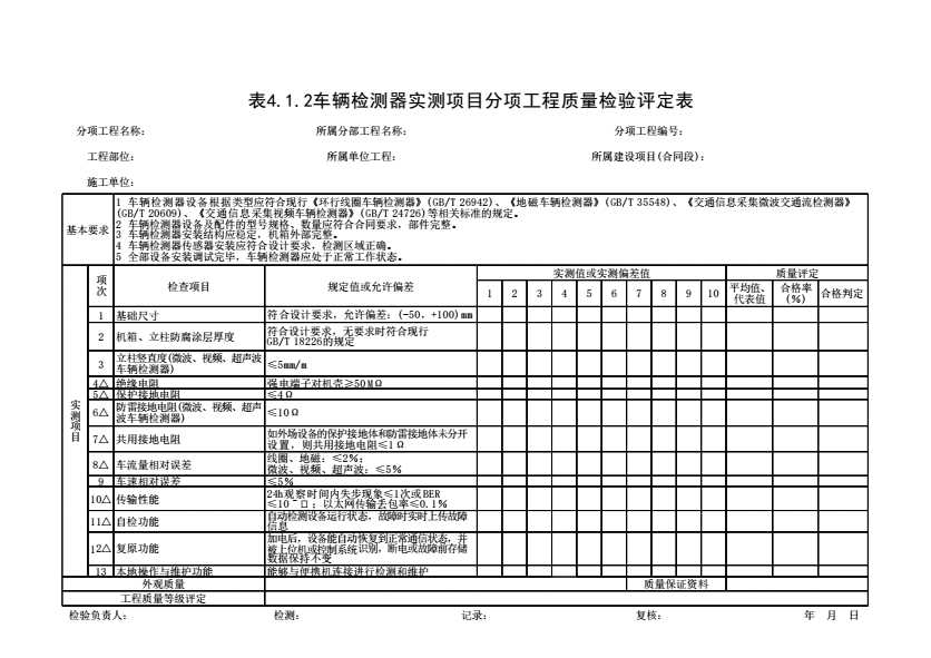 表格名称:表4.1.2 车辆检测器实测项目分项工程质量检验评定表