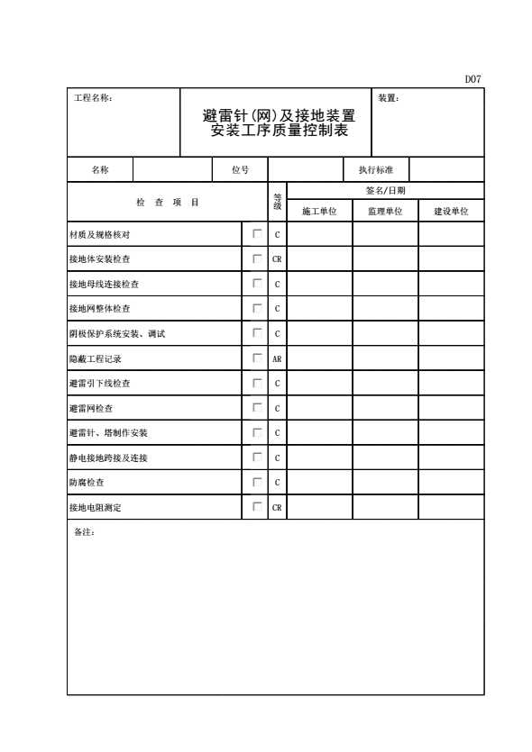 表格名称:D07 避雷针(网)及接地装置安装工序质量控制表