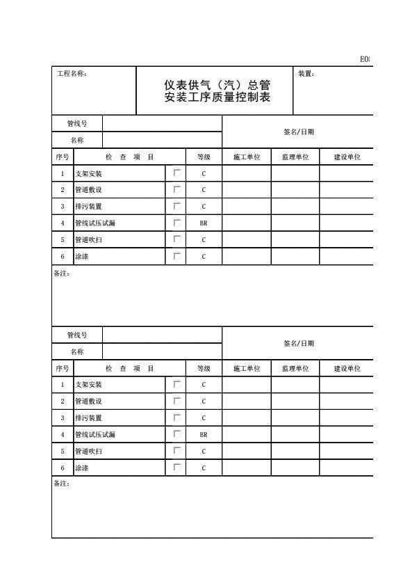 表格名称:E05 仪表供气(汽)总管安装工序质量控制表