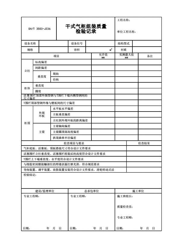 表格名称:SH/T 3503-J336 干式气柜组装质量检验记录